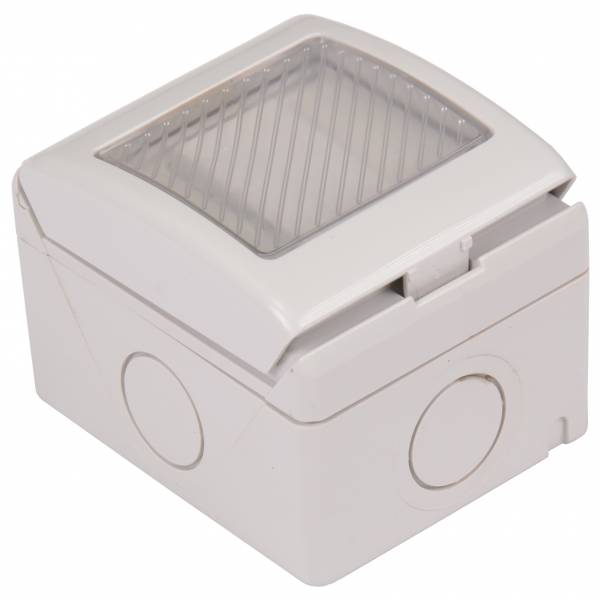 Intrerupator simplu alb montat pe tencuiala cu capac si folie de protectie. 220V.